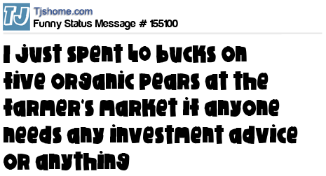 X says I just spent 40 bucks on five organic pears at the farmer's market if anyone needs any investment advice or anything