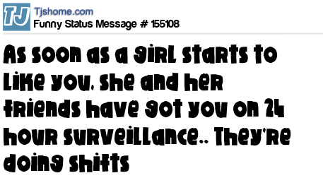 X As soon as a girl starts to like you, she and her friends have got you on 24 hour surveillance.. They're doing shifts