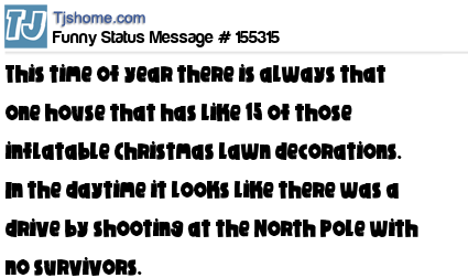 - # 39692 I drove by a house today that had about 15 of those inflatable Christmas lawn decorations. In the daytime it looks like there was a drive by shooting in the North Pole and there were no survivors.
