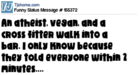 - # 155173 a vegan, an atheist, and a guy who does crossfit all walk into a bar... everyone else walks out of the bar.