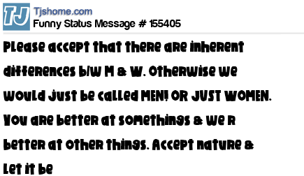 X says Please accept that there are inherent differences b/w M & W. Otherwise we would just be called MEN! OR JUST WOMEN. You are better at somethings & we r better at other things. Accept nature & let it be