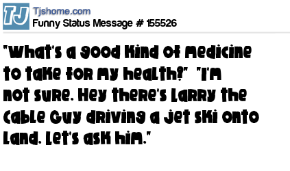 X says "What's a good kind of medicine to take for my health?" "I'm not sure. Hey there's Larry the Cable Guy driving a jet ski onto land. Let's ask him."