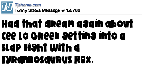 X Had that dream again about Cee Lo Green getting into a slap fight with a Tyrannosaurus Rex.