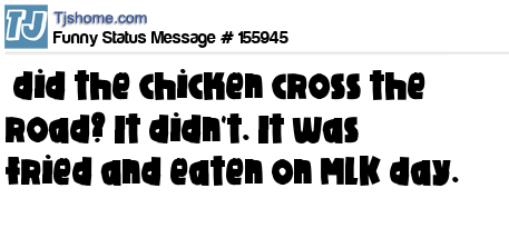 - # 155932 Why did the chicken cross the road? It didn't. It was fried and eaten on MLK day.