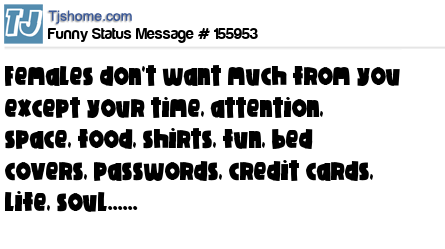 - # 169020 Females don't want much from you except your time, attention, space, food, shirts, fun, bed covers, genitals, passwords, credit cards, life and soul.