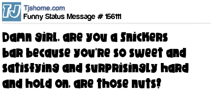 - # 153168 Dang girl,, Are you a Snickers bar? Because you're so sweet and satisfying and surprisingly long lasting,, hold up,,,, are those nuts?