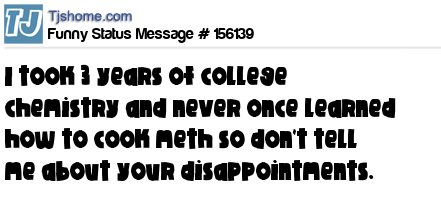 X says I took 3 years of college chemistry and never once learned how to cook meth so don't tell me about your disappointments.
