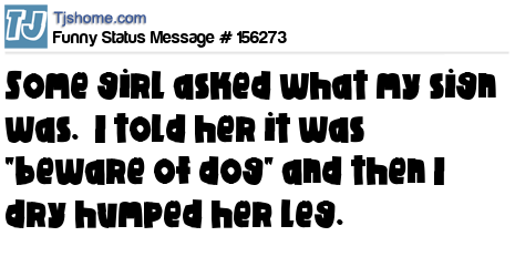 - # 116871 Some girl asked what my sign was. I told her it was "beware of dog" and then I dry humped her leg.