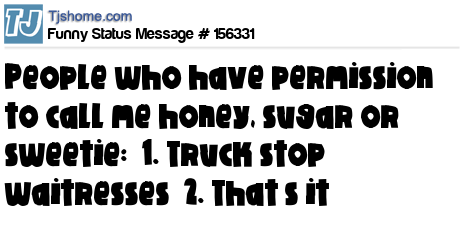 X says People who have permission to call me honey, sugar or sweetie: 1. Truck stop waitresses 2. That’s it