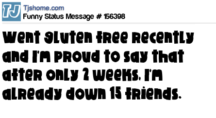 X says Went gluten free recently and I'm proud to say that after only 2 weeks, I'm already down 15 friends.