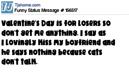 X says Valentine's Day is for losers so don't get me anything, I say as I lovingly kiss my boyfriend and he says nothing because cats don't talk.