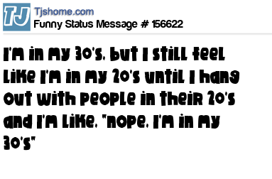 X says I'm in my 30's, but I still feel like I'm in my 20's until I hang out with people in their 20's and I'm like, "nope, I'm in my 30's"