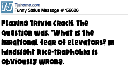 X says Playing Trivia Crack. The question was, "What is the irrational fear of elevators? In hindsight Rice-traphobia is obviously wrong.