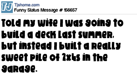 X says Told my wife I was going to build a deck last summer, but instead I built a really sweet pile of 2x4s in the garage.
