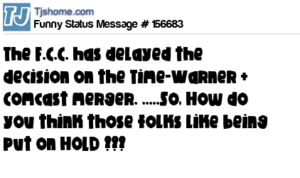 X The F.C.C. has delayed the decision on the Time-Warner + Comcast merger. .....So, How do you think those folks like being put on HOLD ???