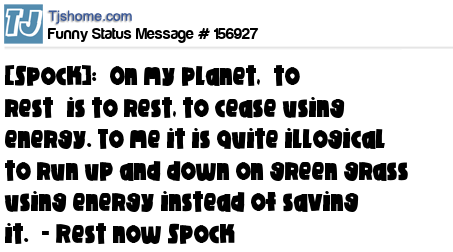 X says [Spock]: “On my planet, “to rest” is to rest, to cease using energy. To me it is quite illogical to run up and down on green grass using energy instead of saving it.” - Rest now Spock