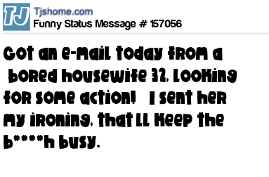 X says Got an e-mail today from a “bored housewife 32, looking for some action!” I sent her my ironing, that’ll keep the b****h busy.