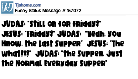 X says JUDAS: "Still on for friday?" JESUS: "Friday?" JUDAS: "Yeah, you know, the Last Supper" JESUS: "The what?!?" JUDAS: "the Supper, just the Normal Everyday Supper"