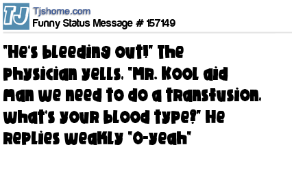 X "He's bleeding out!" The physician yells, "Mr. Kool aid man we need to do a transfusion, what's your blood type?" He replies weakly "O-yeah"