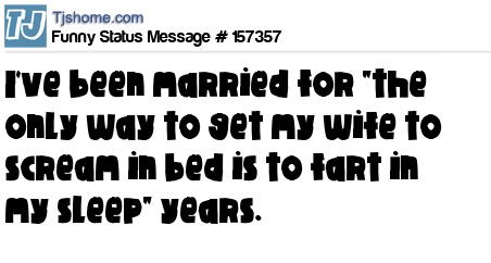 - # 157343 The only time that my wife screams my name in bed is when I fart in my sleep.
