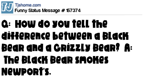 X says Q: How do you tell the difference between a Black Bear and a Grizzly Bear? A: The Black Bear smokes Newport's.