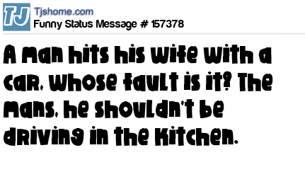 X says A man hits his wife with a car, whose fault is it? The mans, he shouldn't be driving in the kitchen.
