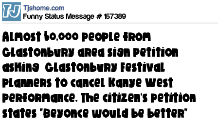 X Almost 60,000 people from Glastonbury area sign petition asking Glastonbury Festival planners to cancel Kanye West performance. The citizen's petition states "Beyonce would be better"