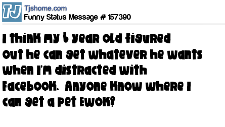 X says I think my 6 year old figured out he can get whatever he wants when I'm distracted with Facebook. Anyone know where I can get a pet Ewok?