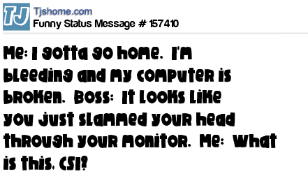 X says Me: I gotta go home. I'm bleeding and my computer is broken. Boss: It looks like you just slammed your head through your monitor. Me: What is this, CSI?