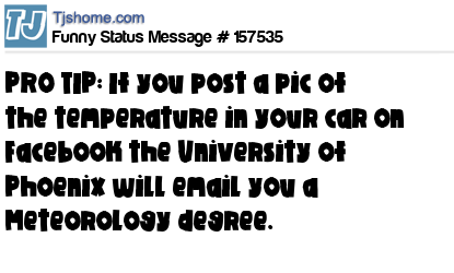 - # 194057 If you post a pic of the temperature in your car on Facebook the University of Phoenix will email you a Meteorology degree.
