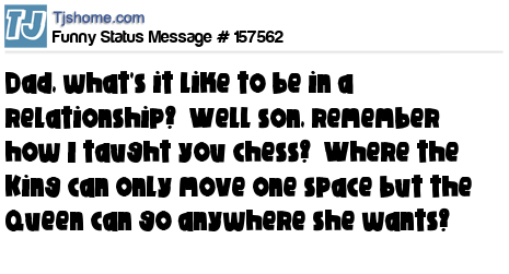 X says Dad, what's it like to be in a relationship? Well son, remember how I taught you chess? Where the King can only move one space but the Queen can go anywhere she wants?
