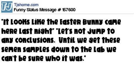 X says "It looks like the Easter Bunny came here last night" "Let's not jump to any conclusions. Until we get these semen samples down to the lab we can't be sure who it was."