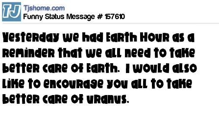 X  Yesterday we had Earth Hour as a reminder that we all need to take better care of Earth.  I would also like to encourage you all to take better care of uranus.