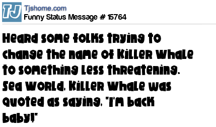 X is heard some folks trying to change the name of Killer Whale to something less threatening. Sea World, Killer Whale was quoted as saying, "I'm back baby!"