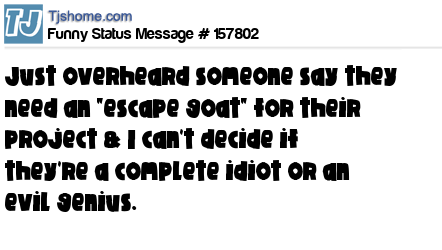 X says Just overheard someone say they need an "escape goat" for their project & I can't decide if they're a complete idiot or an evil genius.