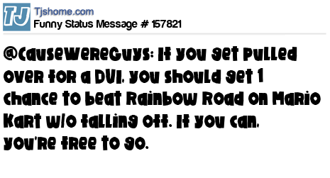 X says @CauseWereGuys: If you get pulled over for a DUI, you should get 1 chance to beat Rainbow Road on Mario Kart w/o falling off. If you can, you're free to go.