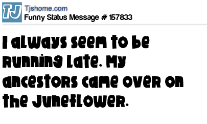 X says I always seem to be running late. My ancestors came over on the Juneflower.