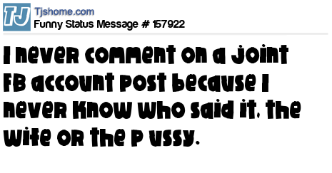 X I never comment on a joint FB account post because I never know who said it, the wife or the p ussy.