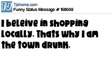 X I beleive in shopping locally. Thats why I am the town drunk.