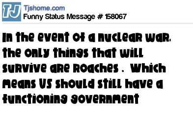 - # 158065 In the event of a nuclear war, the only things that will survive are cockroaches. Which means US should still have a functioning government