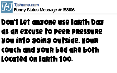X says Don't let anyone use Earth Day as an excuse to peer pressure you into going outside. Your couch and your bed are both located on Earth too.