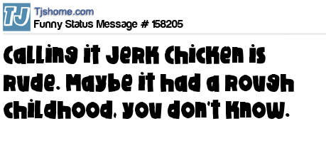- # 187764 Jerk chicken is just like regular chicken, but it drives a BMW and doesn't care about your feelings.