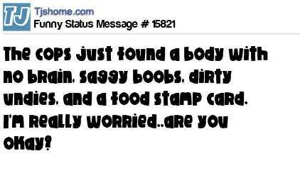 X says the cops just found a body with no brain, saggy boobs, dirty undies, and a food stamp card. I'm really worried..are you okay?