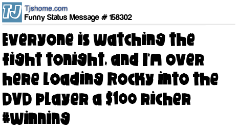 X Everyone is watching the fight tonight, and I'm over here loading Rocky into the DVD player a $100 richer #winning