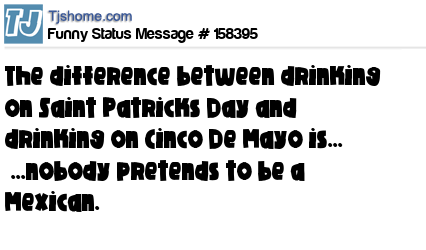 - # 198696 The difference between drinking on St. Patrick's Day and drinking on Cinco De Mayo is that nobody pretends to be a Mexican.