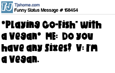 X says *Playing Go-Fish" with a Vegan* ME: Do you have any Sixes? V: I'm a Vegan.