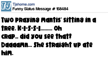 X Two praying mantis' sitting in a tree. K-I-S-S-I......... Oh crap,,, did you see that? Daaaamn... She straight up ate him.