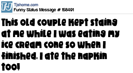 X says This old couple kept staing at me while I was eating my ice cream cone so when I finished, I ate the napkin too!