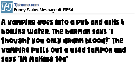 - # 57451 A vampire goes into a bar and asks for boiling water. The barman says "I thought you only drank blood?" The vampire pulls out a used tampon and says "I'm making tea".