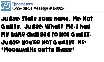 X says Judge: State your name. Me: Not Guilty. Judge: What? Me: I had my name changed to Not Guilty. Judge: You're Not Guilty? Me: *Moonwalks outta there*